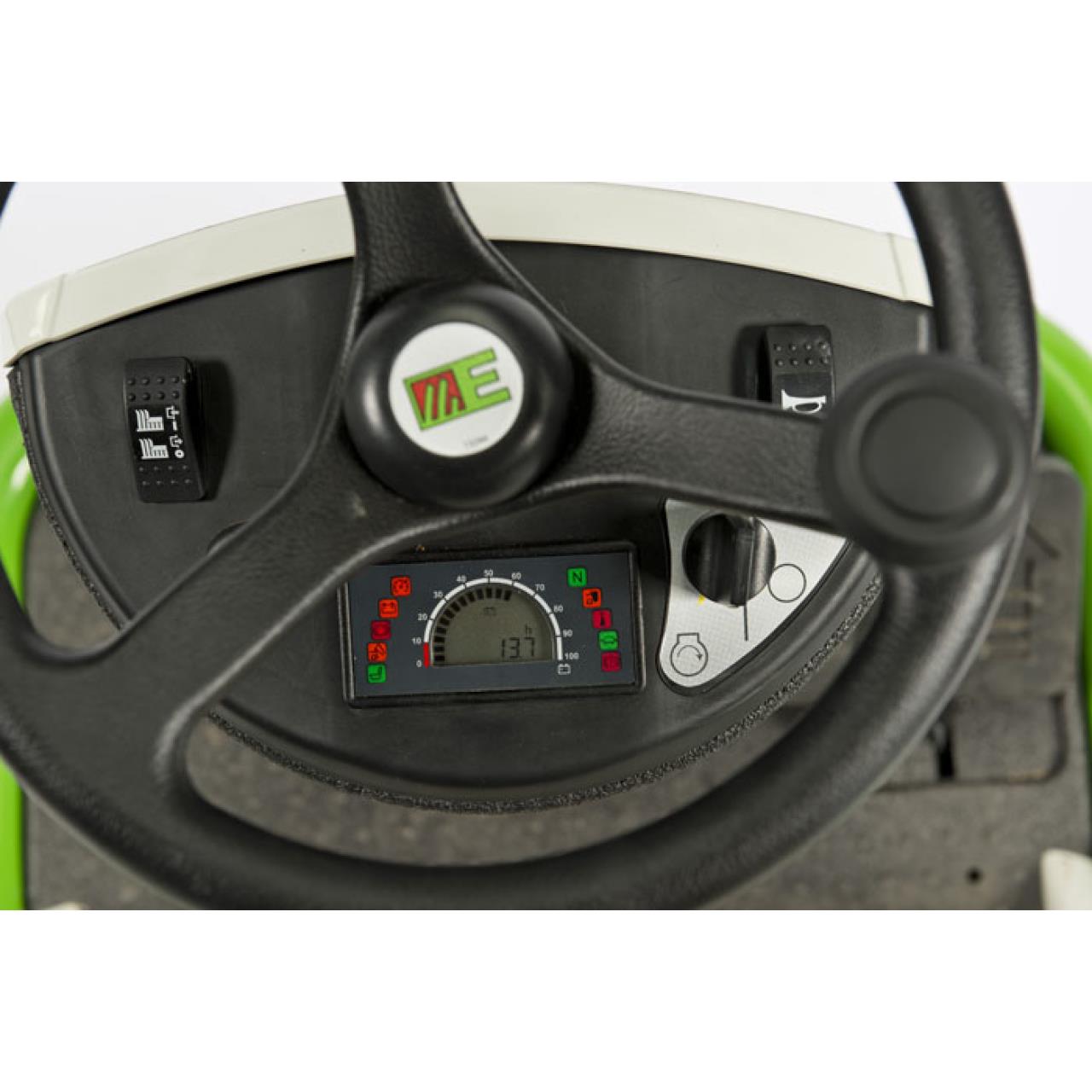 - BEDIENUNGSELEMENTE Elektrostarter. Messerstart. Stundenzähler. elektrische Korbentleerung. Lichtschalter und Batterieladestecker befinden sich am Armaturenbrett.