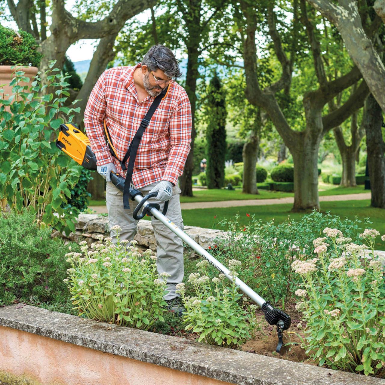 Die akkubetriebene Jät-Bodenhacke CULTIVION ALPHA kann zum Hacken, Auflockern des Bodens und zur pestizidfreien Unkrautbeseitigung eingesetzt werden. Das schnelle und leistungsstarke Gerät ist wegen seiner Bedienfreundlichkeit und guten Handhabung bei Gemüsegärtnern, Winzern und in der Pflege von Park- und Grünanlagen äußerst beliebt. Mit ihrem elastischen Tragegurt folgt die Jät-Bodenhacke geschmeidig allen Bewegungen. Die vier austauschbaren Klingen von acht bis 22 cm Breite bieten jeweils das perfekte Werkzeug für jeden Arbeitsschritt im Beet.